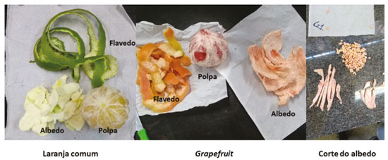 ![]() Figura 2. Separação dos cítricos laranja comum e grapefruit nos seus componentes albedo, flavedo e endocarpo/polpa (esquerda e centro); e preparação da amostra para extração (direita)