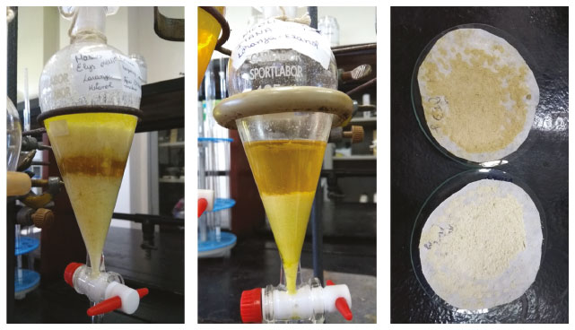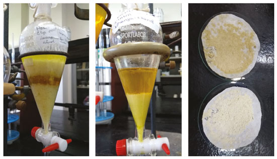 ![]() Figura 3. Aspecto dos funis de separação na extração com diclorometano da suspensão de hesperidina 1 (esquerda e centro) e dos sólidos depois de filtrados (direita)