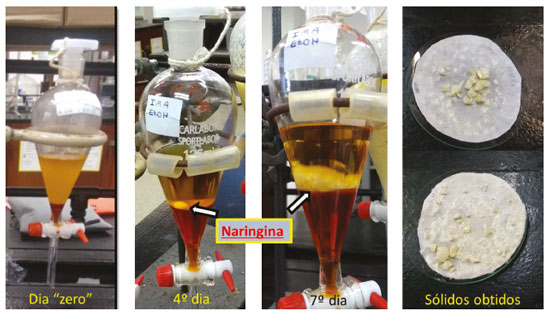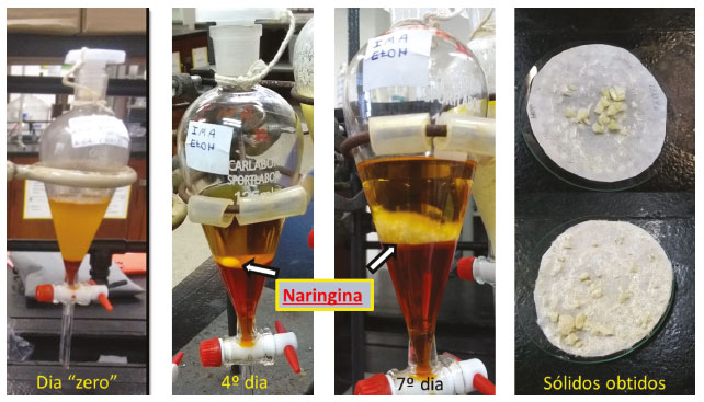 ![]() Figura 4. Evolução do aparecimento da naringina 2 na extração do albedo do grapefruit (esq. para dir.): dia do tratamento, com 4 dias e com 7 dias. Na imagem da direita os sólidos cristalinos obtidos