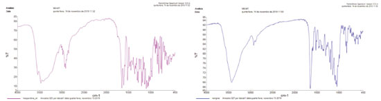 ![]() Figura 5. Espectros no infravermelho (discos de KBr) da hesperidina 1 (esquerda) e naringina 2 (direita)