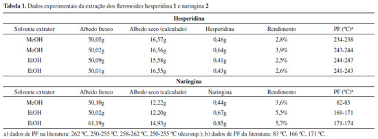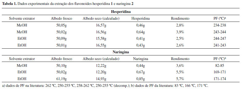 Para fins de cálculos de rendimento dos flavonoides obtidos, tomaram-se como padrão as medidas adotadas na literatura, que consideram como referência a massa de albedo seco utilizada na extração. Como no presente experimento foram empregados albedos frescos (úmidos), tomaram-se os valores de relação entre albedo seco e úmido aqueles descritos na literatura, ou seja, de 33,1% m/m para a laranja comum25 e 24,4% m/m para a grapefruit.24 Alguns dos dados obtidos pelos discentes nos experimentos realizados no laboratório encontram-se descritos na Tabela 1. De um modo geral, a extração da hesperidina 1 a partir da casca de laranja mostrou-se mais eficiente quando metanol foi empregado como solvente extrator, enquanto que no caso da naringina 2, extraída a partir do albedo da casca da grapefruit, o emprego de etanol forneceu melhores rendimentos.