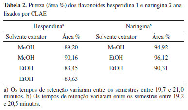 Finalmente, as amostras dos flavonoides isolados e purificados pelos discentes foram analisadas por cromatografia líquida de alta eficiência (CLAE/DAD), como uma forma mais apurada de determinação da pureza dos produtos naturais obtidos, registro dos espectros de UV e de validação da metodologia empregada. Os alunos foram então levados a um laboratório de pesquisa em produtos naturais, que possui um equipamento de CLAE em operação e que já analisou os compostos isolados (Tabela 2). Os discentes realizaram a preparação das soluções, que envolvem pesagem de pequenas quantidades das amostras isoladas (cerca de 5 mg em balão volumétrico de 5 mL, concentração final de ~1 mg mL-1), e a soluções foram filtradas (cerca de 1 mL) para um frasco vial e então analisadas (para cromatogramas e espectros de UV vide Material Suplementar). Observando os resultados de pureza obtidos, pode-se verificar que, no caso da extração da hesperidina 1 a partir do albedo da casca da laranja comum, o cromatograma apresenta uma leve tendência de melhor pureza do flavonoide obtido no procedimento de extração com MeOH como solvente extrator. Já no caso da extração da naringina 2, não parece haver diferença considerável entre a pureza do flavonoide extraído a partir da grapefruit com MeOH ou EtOH. É digno de nota que CCD não pode ser empregada como método para determinação da pureza do flavonoide uma vez que hesperidina é totalmente insolúvel em solventes orgânicos comuns utilizados em laboratórios didáticos. Em laboratórios com infraestrutura mais completa e acessível, espectros de RMN e espectrometria de massas com ionização eletrospray ou ionização química à pressão atmosférica podem ser utilizados na identificação e determinação da pureza dos produtos.