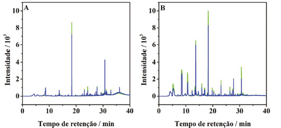 ![]() Figura 1. Cromatogramas obtidos para as amostragens do frasco com mamão na primeira (-) e na segunda repetição (-), utilizando as fibras PDMS (A) e PDMS/DVB (B)