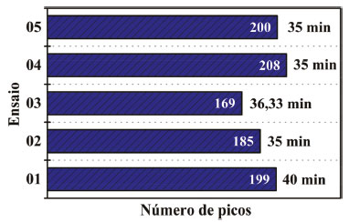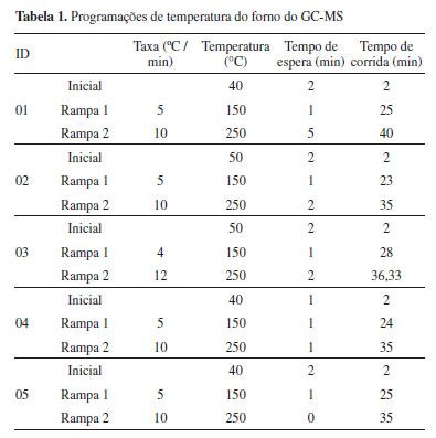 ![]() Figura 2. Número de picos detectados pelo GC-MS e tempo gasto na corrida em cada ensaio com diferentes programações de temperatura do forno
