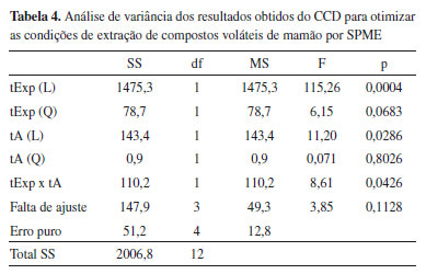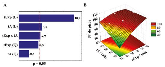 Pelo gráfico de Pareto (Figura 3 A) a significância de cada fator pode ser melhor visualizada. Percebe-se que enquanto os termos lineares do tExp e tA foram positivamente significativos - um aumento nos níveis dessas variáveis ocasiona um aumento na resposta - a interação entre eles foi negativamente significativa, ou seja, um aumento do nível das duas variáveis concomitantemente acarreta em uma diminuição da resposta. Isso pode ter ocorrido devido a uma saturação da fibra quando o tA e o tExp são muito altos. Pela superfície de resposta obtida (Figura 3 B), percebe-se que um nível máximo não foi atingido e que talvez o número de picos detectáveis continuasse aumentando se fosse aumentado o tExp, mantendo o tempo de acondicionamento baixo, por volta de 10 min, por exemplo. Entretanto, após 45 min de tExp a mudança na resposta não é tão grande, sendo que nesse ponto (tA = 10 min e tExp = 45 min) já são amostrados por volta de 100 compostos detectáveis por GC-MS. Dessa forma, 10 min de tA e 45 min de tExp foram selecionados como as melhores condições para a extração não destrutiva de voláteis de mamão.