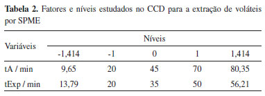 Uma vez que um maior número de voláteis deveria ser detectado para observar também quando uma programação de temperatura ocasionaria uma sobreposição de picos, mamões em estado de maturação mais avançado foram utilizados. A melhor fibra foi empregada e os tempos de acondicionamento e de exposição da fibra também foram de 5 min e 30 min, respectivamente. Planejamento Composto Central As condições de extração dos VOCs por SPME foram otimizadas usando um planejamento composto central (CCD), uma ferramenta estatística multivariada, já que métodos univariados seriam mais dispendiosos (um maior número de experimentos deveria ser feito) e não seria possível avaliar o efeito das interações entre os fatores.18-21 As variáveis selecionadas para a otimização do processo de extração por SPME foram o tempo de acondicionamento (tA, min) e o tempo de exposição da fibra (tExp, min), mantendo-se constante a temperatura (temperatura controlada 25 ± 2 ºC). Os níveis de cada fator estudado estão mostrados na Tabela 2.