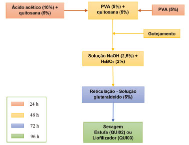 ![]() Figura 1. Fluxograma das etapas da fabricação de esferas de quitosana/PVA com tratamento térmico em estufa e em liofilizador