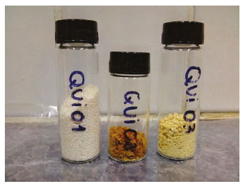 ![]() Figura 2. Fotografia da quitosana em pó (QUI01), esferas de quitosana/PVA secas em estufa (QUI02) e esferas de quitosana/PVA secas em liofilizador (QUI03)
