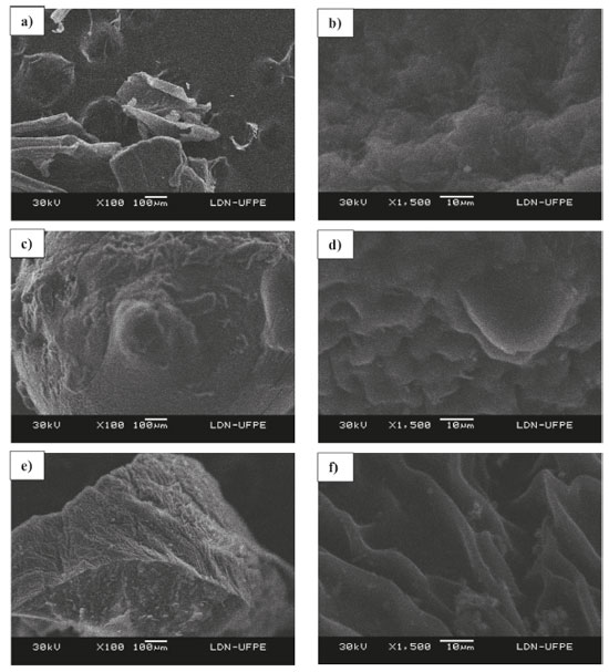 ![]() Figura 3. Imagens das amostras obtidas por MEV: quitosana em pó (QUI01) com aumento de 100x (a) e 1500x (b); esferas de quitosana/PVA secas em estufa (QUI02) com aumento de 100x (c) e 1500x (d); esferas de quitosana/PVA secas em liofilizador (QUI03) com aumento de 100x (e) e 1500x (f)