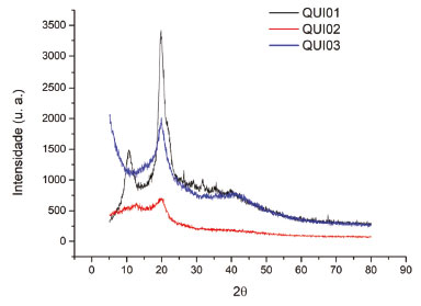 ![]() Figura 4. Difratogramas da quitosana (QUI01), das esferas secas em estufa (QUI02) e das esferas secas em liofilizador (QUI03)