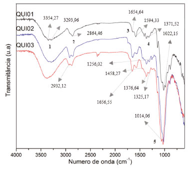 ![]() Figura 5. Espectros FTIR-ATR da quitosana em pó - QUI01, das esferas QUI02 e QUI03