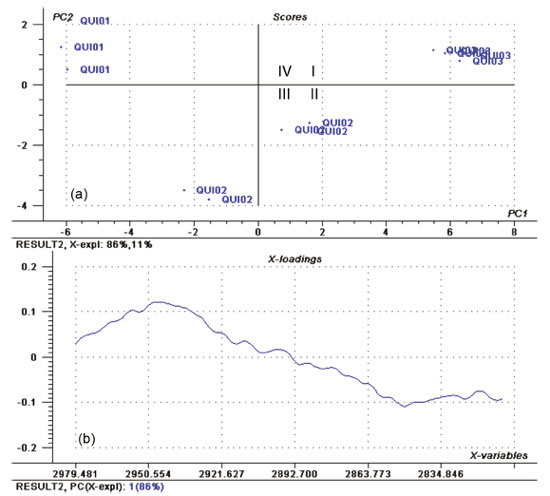 ![]() Figura 6. Análise de Componente Principal: a) gráfico de dispersão das componentes principais PC1 e PC2 no intervalo dos espectros FTIR entre 2979 e 2810 cm-1 e b) gráfico das cargas da componente principal