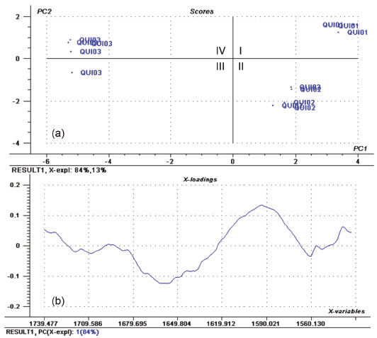 ![]() Figura 7. Análise de Componente Principal: a) gráfico de dispersão das componentes principais PC1 e PC2 no intervalo dos espectros FTIR entre 1739 e 1533 cm-1 e b) gráfico das cargas da componente principal