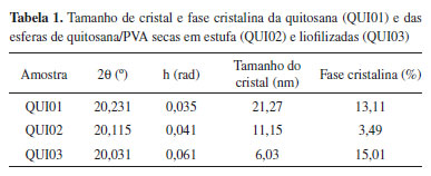 Os tamanhos de cristais e as fases cristalinas para QUI01, QUI02 e QUI03 encontram-se na Tabela 1. A amostra QUI01 apresentou tamanho de partícula em torno de 20 nm, que corresponde ao valor encontrado na literatura para quitina e quitosana.4 Por outro lado, as esferas da amostra QUI03 apresentaram tamanho de partícula em torno de 6 nm, enquanto que para as esferas QUI02 o valor encontrado de aproximadamente 11 nm. A variação do tamanho do cristal está associada ao tratamento térmico a que as esferas foram submetidas. A liofilização permitiu adquirir menor tamanho de cristal quando comparada com a secagem em estufa à 60 ºC. Uma possível explicação é que no processo térmico os líquidos da superfície evaporam rapidamente conduzindo a formação de uma camada de material seco na parte externa que faz com a esfera se torne maior do que as esferas que foram produzidas na liofilização.