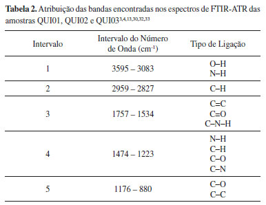 A cristalinidade dos materiais produzidos também mostrou diferenças e corroboram com os difratogramas exibidos na Figura 4. As esferas da amostra QUI03 (liofilizador) apresentaram cristalinidade próxima da amostra QUI01, contudo, com uma mudança na organização cristalina que é mostrada pelo desaparecimento do pico 2θ = 10° e formação de um pico leve em torno 2θ = 42°. Esse resultado reforma a influência do tratamento na estrutura cristalina das esferas produzidas. A cristalinidade das esferas QUI02 se tornou muito menor, ou seja, o aquecimento na preparação das esferas à 60 ºC durante 24 h, resultou em um material com maior fase amorfa muito maior quando comparada com as outras amostras. O desaparecimento do pico 2θ = 10° e o não aparecimento de nenhum outro pico no difratograma (Figura 4) corrobora com esta observação. Esse fato pode ser atribuído à agitação das moléculas sob aquecimento que interferiram no processo de produção e estabilização dos cristais, prejudicando a formação de uma organização cristalina na amostra. Entretanto, essa maior região amorfa da amostra QUI02 poderia resultar em maior abertura e receptividade em processos de adsorção quando comparada com as regiões cristalinas, que possuem estruturas com maior interação entre as moléculas que compõe o material. Espectroscopia no infravermelho por transformada de Fourier (FTIR) Na Figura 5 podem ser visualizados os espectros FTIR-ATR das amostras QUI01, QUI02 e QUI03. O espectro da amostra QUI01 apresentou bandas características da quitosana que já foram registradas em outros estudos.4,18,30 Não foram encontradas diferenças significativas nos espectros das amostras QUI02 e QUI03. Para facilitar a identificação das bandas nos espectros, cinco intervalos foram identificados e atribuição das bancas em cada intervalo estão apresentadas na Tabela 2.