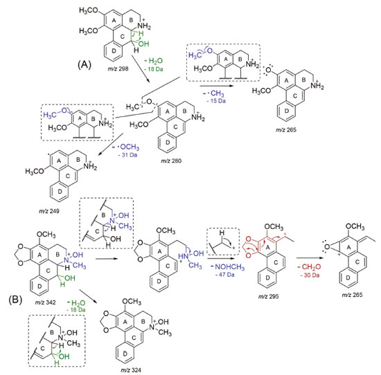 ![]() Figure 2.Proposed fragmentation pathways for the aporphine alkaloids nornuciferidine (A, m/z 298) and guatterine N-oxide (B, m/z 342)