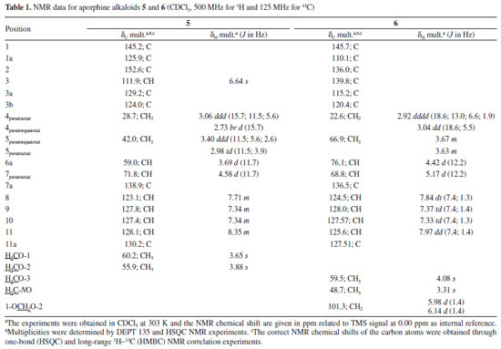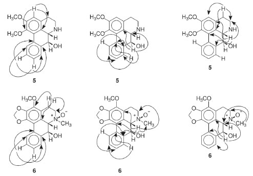 ![]() Figure 3. Main key correlations observed in the HMBC (arrows) experiment for the alkaloids 5 and 6