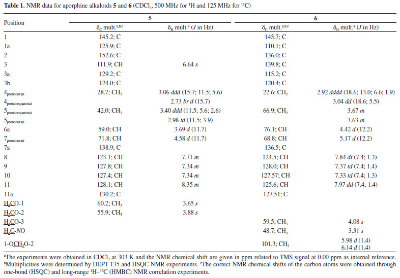 The 1H NMR spectrum of compound 5 along with 1H-1H correlation map from COSY NMR experiment revealed the presence of two spin systems; one consisting of the signals at δH 3.06 (1H, ddd, J = 15.7, 11.5, and 5.6 Hz, H-4 pseudoaxial) and δH 2.73 (1H, br d, J = 15.7 Hz, H-4 pseudoequatorial) as well as δH 3.40 (1H, ddd, J = 11.5, 5.6 and 2.6 Hz, H-5 pseudoequatorial) and δH 2.98 (1H, td, J = 11.5 and 3.9 Hz, H-5 pseudoaxial); and the other comprising the signals at δH 3.69 (1H, d, J = 11.7 Hz, H-6a pseudoaxial) and δH 4.58 (1H, d, J = 11.7 Hz, H-7 pseudoaxial). The signal at δH 4.58 also indicate the presence of a β-hydroxyl group in the molecule located at C-7,23 being in accordance with that observed in the mass spectrum. Furthermore, it was observed a singlet at δH 6.64 (1H, H-3), indicative of an pentasubstituted benzene ring, as well as a spin system at δH 8.35 (1H, m, H-11), δH 7.71 (1H, m, H-8), and δH 7.34 (2H, m, H-9 and H-10), confirming the presence a disubstituted benzene ring. These signals observed in the aliphatic and aromatic regions are characteristic of aporphine alkaloids.8,20,25 In addition, the presence of signals at δH 3.88 and δH 3.65 (each, 3H, s) were assigned to two methoxyl groups. The location of the methoxyl groups were established based on the long-range 1H-13C correlation map from HMBC NMR experiment (Table 1 and Figure 3). This analysis revealed that the hydrogen at δH 6.64 (H-3) showed long-range 1H-13C correlation to 3J with the carbons at δC 145.2 (C-1), δC 124.0 (3b), and δC 28.7 (C-4), and to 2J with the carbon at δC 152.6 (C-2). The same analysis was performed for the presence of the hydroxyl group located in the C ring. The signal of the hydrogen at δH 4.58 (H-7) showed long-range 1H-13C correlation to 3J with the signals of the carbons at δC 123.1 (C-8), δC 124.0 (C-3b), and δC 130.2 (11a), and to 2J with the carbons at δC 59.0 (C-6a) and δC 138.9 (C-7a). This substitution was also confirmed by correlation of the signal of the hydrogen at δH 3.69 (H-6a) with the signals of the carbons at δC 42.0 (C-5), δC 71.8 (C-7), δC 124.0 (C-3b), δC 125.9 (C-1a), δC 129.2 (C-3a), and δC 138.9 (C-7a) (Figure 3). Therefore, based on these NMR data, compound 5 was established as the aporphine alkaloid known as nornuciferidine. The complete assignments for all 1H and 13C NMR chemical shifts were established by one-bond (HSQC) and long-range (HMBC) 1H-13C NMR correlation experiments and were described in the Table 1. This alkaloid is described for the second time in the Annonaceae family, only in the Duguetia genus that was reported for the first time in the Duguetia spixiana Mart.1,22,25 After conducting of the 1D/2D NMR experiments for nornuciferidine, it was observed in the spectra signals of its decomposition, probably due to the long wait for analysis in acidic solvent (CDCl3). This observation indicates that the substance is unstable, which may explain its low occurrence in the literature. However, no support for this report was found.