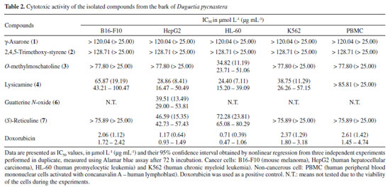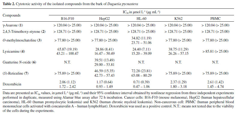 CONCLUSIONS The phytochemical investigation of the bark of D. pycnastera led to the isolation and identification of seven known compounds (1-7); two asarone-derived phenylpropanoids, γ-asarone (1) and 2,4,5-trimethoxy-styrene (2) of the hexane extract; four aporphine alkaloids, O-methylmoschatoline (3), lysicamine (4), nornuciferidine (5), and guatterine N-oxide (6), and one benzyltetrahydroisoquinoline alkaloid, (S)-reticuline (7) of the methanol extract. The isolated compounds are described for the first time in D. pycnastera. γ-Asarone is reported for the first time in the Annonaceae family. Nornuciferidine is described for the second time in the Annonaceae and only in the Duguetia. Guatterine N-oxide has been reported for the third time in the Annonaceae only in the Duguetia and Guatteria genera. These results are especially important for the chemotaxonomic point of view and contributes for the chemotaxonomic knowledge of the species of the Annonaceae family. The cytotoxic activity of the isolated compounds (except for nornuciferidine) were evaluated against cancer and non-cancerous cell lines (except for guatterine N-oxide that was only evaluated against HepG2), in which lysicamine was the most potent one, mainly against HL-60, HepG2, and K562 with IC50 values of 24.40, 28.86 and 38.75 µmol L-1, respectively, being moderately active when compared to doxorubicin.