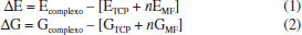 Frente aos complexos obtidos nas estequiometrias 1:1, 1:2 e 1:3, foram calculadas as variações da energia eletrônica (ΔE) e energia livre de Gibbs (ΔG), no nível B3LYP/6-31G(d,p), em fase gasosa, cujos valores encontram-se apresentados na Tabela 1, pela qual verifica-se que os valores de ΔE e ΔG se tornam mais negativos à medida que mais moléculas de MFs são complexadas à MM, dado o maior número de ligações de hidrogênio estabelecidas.35