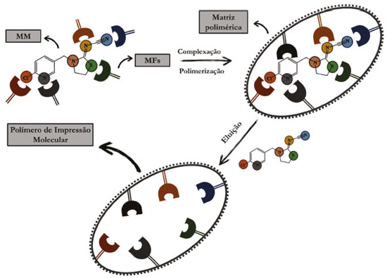 ![]() Figura 2. Representação esquemática das etapas envolvidas na síntese de um MIP. Fonte: próprios autores