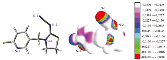 ![]() Figura 3. Mapa de potencial eletrostático molecular para o TCP, com a escala de valores de distribuição de carga do tipo Mulliken
