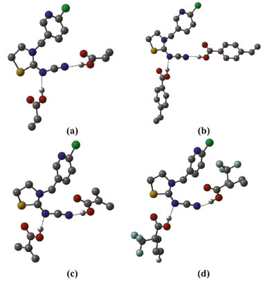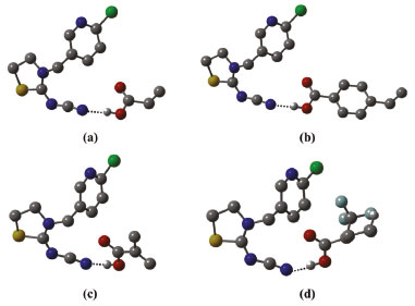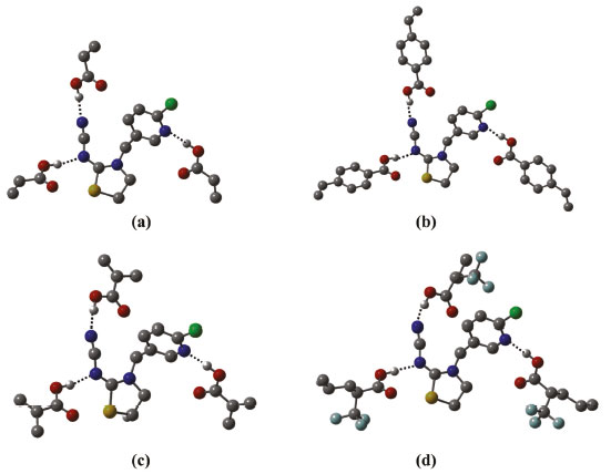 ![]() Figura 4. Estruturas otimizadas no nível B3LYP/6-31G(d,p) dos complexos de pré-polimerização, na estequiometria 1:1. (a) TCP-(AA)1; (b) TCP-(APV)1; (c) TCP-(MAA)1 e (d) TCP-(TFMAA)1. As ligações de hidrogênio intermoleculares estabelecidas são mostradas como linhas pontilhadas e os hidrogênios não envolvidos em ligações de hidrogênio omitidos para facilitar a visualização