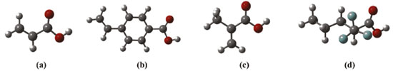 Por meio da análise dos valores apresentados na Tabela 1, nota-se que os complexos mais estáveis são obtidos quando se emprega o ácido 2-(trifluorometil)-arílico (TFMAA) como monômero funcional, sendo em todas as estequiometrias avaliadas a espécie que conduziu a formação de complexos com valores mais estáveis de ΔE e ΔG. A justificativa para essa estabilidade adicional se deve ao fato do TFMAA ser a espécie mais ácida (pKa ≅ 2,8)39 dentre as testadas e, por consequência, atuar como melhor doador de ligações de hidrogênio em comparação as espécies AA, MAA e APV. Já em termos estruturais, a maior estabilidade do complexo com TFMAA pode ser também explicada pelo efeito indutivo negativo do grupo CF3, tendo em vista que o átomo de flúor (F) é o átomo mais eletronegativo da cadeia do TFMAA, de modo que atrai para si maior densidade eletrônica, tornando essa região da molécula mais carregada negativamente.40,41 Em contrapartida, a extremidade que contém o hidrogênio ácido, quando comparada com os demais MFs (Figura 7), apresenta menor densidade eletrônica, ou seja, maior densidade de carga positiva sob o átomo de H ácido (δ+H), com possibilidade de formação de ligações de hidrogênio mais fortes.37