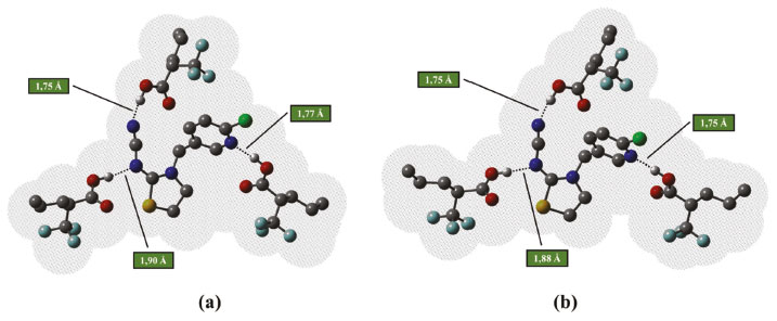 ![]() Figura 8. Estruturas otimizadas no nível B3LYP/6-31G(d,p) dos complexos de pré-polimerização na presença de TFMAA, na estequiometria 1:3, mostrando a superfície de acesso ao solvente implícito: tolueno. Em (a) estrutura otimizada em fase gasosa/cálculo no ponto em solvente tolueno e em (b) estrutura otimizada em solvente tolueno. As ligações de hidrogênio intermoleculares estabelecidas são mostradas como linhas pontilhadas e os hidrogênios não envolvidos em ligações de hidrogênio omitidos para facilitar a visualização