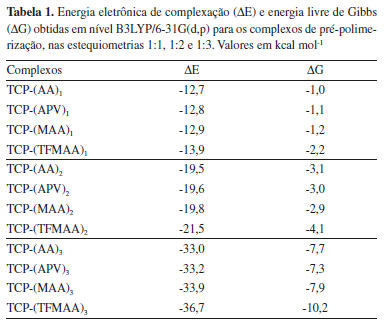 METODOLOGIA TÉORICA Inicialmente, cálculos de otimização de geometria, no nível DFT/B3LYP/6-31G(d,p)34,35 foram realizados para as espécies químicas isoladas, TCP e todos MFs avaliados, tendo sido escolhidos: ácido acrílico (AA), ácido metacrílico (MAA), ácido p-vinilbenzóico (APV) e ácido 2-(trifluorometil)-arílico (TFMAA), devido ao caráter básico do TCP, bem como pelo fato de serem os MFs mais utilizados em estudos de MIPs. Todas as estruturas foram completamente otimizadas e caracterizadas como mínimos verdadeiros na Superfície de Energia Potencial (SEP) através da análise das frequências harmônicas, sendo todas as frequências calculadas reais. A fim de estabelecer o MF mais seletivo e a estequiometria mais adequada para os complexos, calculou-se a variação da energia eletrônica de complexação (ΔE) e a variação da energia livre de Gibbs (ΔG), associadas à formação de cada um dos complexos de pré-polimerização, a partir das Equações (1) e (2), sendo o termo n referente ao coeficiente estequiométrico do MF, o qual teve seu valor variado de 1 a 3, gerando complexos nas razões molares 1:1, 1:2 e 1:3 e os termos G e E referentes respectivamente, a energia de Gibbs e eletrônica absolutas do complexo, da molécula TCP e dos MFs avaliados. ![]() Uma vez definida a estequiometria mais adequada, foi conduzido o estudo da influência de sete solventes na síntese do MIP proposto, por meio do teste de duas metodologias distintas:
