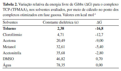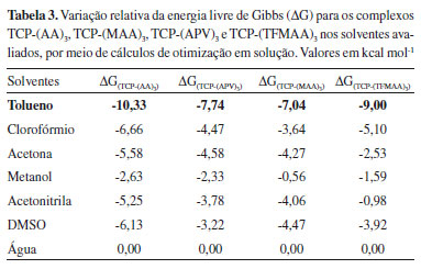 Assim, frente aos dados apresentados na Tabela 1 e obtidos via cálculos de otimização em fase gasosa, pode-se concluir que o complexo de pré-polimerização formado na presença de TFMAA como MF, na estequiometria 1:3, leva à condução do melhor MIP para o TCP, quanto à natureza química e à razão molar da complexação. Seleção do solvente Com a finalidade de definir o solvente mais apropriado para a formação do complexo de pré-polimerização, foram avaliados sete solventes comumente utilizados na síntese de MIPs, de diferentes polaridades e, portanto, de diferentes constantes dielétricas (ε), considerando que a morfologia e porosidade dos MIPs obtidos dependem fundamentalmente das condições sintéticas empregadas, e que solventes porogênicos, apolares e de baixas constantes dielétricas, fornecem um melhor meio reacional para a síntese, por não atuarem como competidores na formação de ligações de hidrogênio, bem como por atribuírem alta porosidade e difusão facilitada do analito em direção aos sítios seletivos do material.16 Utilizando-se do modelo de solvatação SMD,36,42 no qual há a descrição do solvente como um dielétrico contínuo e homogêneo, caracterizado pela sua ε, foram obtidos os valores de ΔG nos sete solventes avaliados por meio de duas metodologias distintas (OPTgas/CPsolv e OPTsolv) a fim de comparar precisão dos resultados e apontar a metodologia mais adequada para o estudo computacional dos complexos de pré-polimerização. Discussão metodológica Frente aos resultados obtidos (Tabelas 2 e 3), pode-se constatar, por meio de ambas as metodologias (OPTgas/CPsolv e OPTsolv), a influência direta dos valores da constante dielétrica dos solventes, gerando valores de ΔG maiores quanto maior ε, tendo sido obtidos os valores mais estáveis de ΔG ao se empregar o tolueno como solvente em todos os casos. Tal comportamento pode ser justificado pelo campo de reação desse solvente ser menor, o que reflete em efeitos de polarização menos pronunciados no complexo de pré-polimerização, que garantem também maior estabilidade, seja para o complexo TCP-(TFMAA)3 otimizado em fase gasosa, seja para os complexos TCP-(AA)3, TCP-(APV)3, TCP-(MAA)3 e TCP-(TFMAA)3, otimizados na presença de solvente.