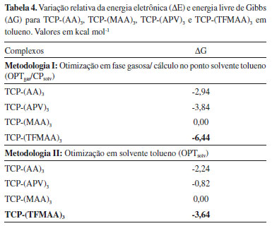 Avaliando os valores das variações de energia (ΔG) para a formação dos complexos em estequiometria 1:3 (Tabela 4), com otimização em fase gasosa e otimização solvente tolueno, identifica-se que os resultados se confluem à medida que os valores de ΔG indicam a maior estabilidade para o complexo formado a partir da espécie TFMAA em solvente tolueno utilizando as duas metodologias de cálculo, porém com menor custo computacional ao se utilizar a Metodologia I (OPTgas/CPsolv). Além disso, de acordo com as estruturas apresentadas na Figura 8, do complexo TCP-(TFMAA)3 formado, verifica-se que ambas metodologias fornecem resultados estruturais semelhantes, com os comprimentos das ligações de hidrogênio estabelecidas apenas ligeiramente diferentes.