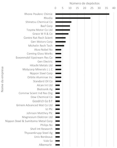 Pela análise da curva apresentada na Figura 4, tem-se uma "previsão" de desenvolvimento tecnológico das terras raras até o ano de 2300. No entanto, considerando-se a quantidade anual de depósitos no Brasil, as tecnologias em terras raras podem ser definidas como emergentes até o ano de 2100, quando teriam um rápido crescimento atingindo a saturação tecnológica em 2200. Tal saturação tende a ocorrer caso a frequência de depósitos deste tipo de tecnologia no país ocorra conforme as últimas cinco décadas. É preciso frisar que isso é uma análise matemática simplificada que não leva em consideração fatores externos que, provavelmente, deslocariam essa curva para mais perto ou longe da atualidade. Além disso, analisa apenas a frequência de depósitos anuais. Para se ter uma análise mais fidedigna sobre a saturação de tecnologias em terras raras, de um modo geral, esse tipo de análise deveria ser feito num contexto mundial, uma vez que os desenvolvedores de tecnologias nessa área, em sua grande maioria, não são originários do Brasil. ![]() em que as variáveis da Equação 21 são: A1 = -50,913 ± 29,912; A2 = 179420,309 ± 2,810.107; x0 = 2156,897 ± 3670,400; dx = 23,084 ± 8,139. Como pode ser visto na Figura 5, os grandes depositantes de patentes no Brasil são basicamente empresas estrangeiras, com a presença de algumas poucas universidades. Um total de 220 depositantes distintos foram encontrados na análise patentométrica e, para melhor, visualização desses dados, os 34 mais relevantes foram considerados para a construção do gráfico. Uma atenção especial deve ser dada para o único representante brasileiro no gráfico: a empresa Vale S.A. que ocupa a 33ª posição.
