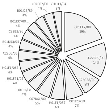 ![]() Figura 6. Concentração tecnológica das patentes depositadas no Brasil referentes às terras raras, medidas pelos quinze IPC mais relevantes de um total de 56 classes distintas e 121 subclasses