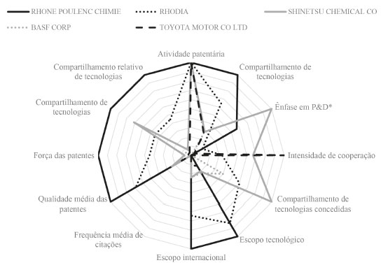 Para a análise da Figura 7, devem ser excluídas as chamadas palavras "stop words", como elementos de ligação, por exemplo. A recorrência das palavras categorizantes dos tipos de proteção - método, preparação, composição, produção, e outras, sempre serão termos de alta relevância, uma vez que aparecem em praticamente todos os tipos de patentes. Ainda dentro dessa nuvem de palavras, é facilmente perceptível a recorrência dos termos "catalisador", "liga", "aço". Esse tipo de análise pode e deve ser cruzado com a análise dos IPC, a fim de detectar quais campos tecnológicos possuem maior relevância para o setor analisado. A utilização de ferramentas mais sofisticadas possibilita o cruzamento dos dados para formar análises de rede social e nós, que permitem detectar possíveis gargalos e possibilidades de interação entre tecnologias. Assim, é possível obter novas e mais completas análises das tecnologias, bem como detectar possibilidades de geração de novos negócios e interações entre agentes internos e externos. A literatura já dispõe de diversos tipos de trabalho nesse contexto, e para não ser muito extensivo no presente artigo, recomenda-se a leitura cuidadosa dos trabalhos de Aaldering et al.25 e Pereira et al.26 Os cinco mais expressivos depositantes de patentes na área analisada foram avaliados segundo os indicadores propostos pelo professor Holger Ernst. Os dados estão expressos na Tabela 2 e a visualização gráfica pode ser conferida na Figura 8. A Figura 8 foi normalizada para melhor visualização dos eixos. Pelos índices analisados a empresa Rhone Poulenc Chimie é a que apresenta um índice médio maior de qualidade de patentes. Novamente, a transdisciplinaridade é uma ferramenta fundamental nesse tipo de análise, uma vez que podem ser incluídos aqui dados econômicos dessas empresas de forma a aumentar a qualidade do mapeamento. Dados de produção tecnológica obtidos pelos índices de patenteamento, cruzados com dados de participação de mercado, ativos intangíveis, P&D, dentre outros, quando analisados em conjunto, podem indicar o grau de utilização do segredo industrial como estratégia de proteção dos resultados de P&D das empresas.