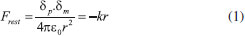 Na situação descrita acima, há uma força de restauração (Frest) entre os íons da rede cristalina do material e os elétrons no sentido de restauração da posição de equilíbrio. Uma vez que o campo elétrico da radiação excitante oscila com o tempo, a perturbação da nuvem eletrônica é periódica, assim como a força de restauração, de tal forma que os elétrons do metal oscilam com a mesma frequência da radiação incidente. Para uma determinada frequência de excitação, a interação com a densidade eletrônica leva a uma máxima polarização, associada ao movimento coerente dos elétrons de superfície do metal, estado que é conhecido pelo termo plasmon de superfície localizado (as oscilações são confinadas à superfície da nanopartícula, ao contrário do caso de materiais estendidos, em que se observa propagação).17,18 A excitação ressonante do plasmon de superfície confere diversas características para nanomateriais, principalmente os metálicos. Por exemplo, enquanto dispersões coloidais de nanoesferas de Au de 40 nm de diâmetro em água apresentam coloração avermelhada, dispersões de nanoesferas de Ag com as mesmas dimensões apresentam coloração amarelada. A frequência da radiação necessária para excitar os modos plasmônicos em um nanomaterial metálico depende de aspectos como composição química (do metal e do meio em que este se encontra), tamanho e forma da nanopartícula.22 Tal dependência pode ser amplamente explorada através de simulações computacionais, como será mostrado neste trabalho com alguns exemplos. Porém, é possível criar um modelo simples para prever qualitativamente as tendências a serem observadas para a frequência de ressonância de plasmon de superfície. Tal modelo assume a lei de Coulomb para representar a força de restauração, que também pode ser descrita pela lei de Hooke (comumente empregada no contexto de espectroscopia vibracional): ![]() onde δp e δm são, respectivamente, as densidades de carga positiva e negativa associadas a polarização da nuvem eletrônica devido a excitação plasmônica. é a constante de força associada a restauração, que guarda informações sobre a frequência do processo ressonante: , com m representando a massa do elétron e Ωplasmon a frequência de ressonância do plasmon de superfície. representa a magnitude de separação entre as densidades de carga positiva e negativa. A Eq. 1 pode, portanto, ser utilizada para investigar as dependências da frequência associada ao plasmon de superfície para diferentes nanomateriais: ![]() A Eq. 2 indica uma dependência qualitativa da frequência de ressonância do plasmon de superfície com a polarização no material devido ao campo elétrico da radiação, representada pelas densidades de carga. Além disso, nota-se uma dependência com aspectos geométricos (r) da nanopartícula, os quais definem a magnitude de separação de cargas. Uma maneira de se caracterizar a frequência de ressonância do plasmon de superfície é através de medidas de espectroscopia eletrônica, utilizando radiação excitante na região do UV-Vis, por exemplo. Neste caso, a análise de nanopartículas metálicas suspensas em um solvente envolve a atenuação da intensidade do feixe de luz em função do comprimento de onda incidente. Dois principais motivos podem ser utilizados como argumentação para esta afirmação: