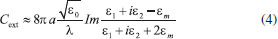 No caso de Au e Cu, nos comprimentos de onda em que a condição ε1 = -2εágua é satisfeita, a parte imaginária (Figura 4B) apresenta valores consideravelmente maiores que os observados para Ag e Al, principalmente devido à existência de transições interbandas nestes metais.17-19,31 Este maior amortecimento à dinâmica de movimentação dos elétrons acaba modificando a condição de ressonância nestes metais. Com isto, podem ser observados dois efeitos importantes nos espectros de extinção de Au e Cu em relação aos outros metais: