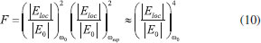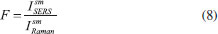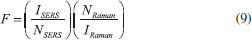 O EFEITO SERS E AS PROPRIEDADES DE CAMPO PRÓXIMO As Figuras 12E e 12F mostram que a magnitude do campo elétrico em torno da nanopartícula é profundamente alterada pela excitação ressonante do plasmon de superfície. O aumento da magnitude do campo elétrico local contribui para o aumento das intensidades de sinais espectroscópicos de moléculas adsorvidas (ou próximas) à superfície das nanopartículas, sobretudo nos HSs.18,134 Um exemplo de espectroscopia intensificada pela excitação do plasmon de superfície é o SERS, que será utilizada neste trabalho como exemplo para explorar a relação entre as propriedades locais resultantes da excitação plasmônica e a amplificação de sinais espectroscópicos.18,35,41,62,68,107,135-141 A abordagem apresentada aqui é focada exclusivamente nas propriedades plasmônicas das nanopartículas. Para mais detalhes sobre o efeito SERS em língua portuguesa, recomenda-se a leitura do trabalho de Faria et al., que apresentam uma perspectiva histórica do efeito e indicam algumas aplicações.142 A medida da magnitude de intensificação no efeito SERS é tipicamente conhecida por fator de intensificação (F), que é formalmente definido como a relação entre as intensidades para uma única molécula nos espectros SERS (IsmSERS) e Raman (IsmRaman):143 ![]() Na prática, estimativas de performance de um determinado substrato SERS (material utilizado para obtenção dos espectros) são realizadas levando-se em consideração estimativas do número de moléculas (N) contribuindo para o sinal SERS e Raman, ou seja:143-145 ![]() onde ISERS e IRaman são as intensidades SERS e Raman geradas por NSERS e NRaman moléculas, respectivamente. Neste tipo de abordagem (Eq. 9) para caracterização da performance de um substrato SERS, a dificuldade está sempre na estimativa do número de moléculas contribuindo para o sinal, o que, dependendo das aproximações utilizadas, pode levar a uma variabilidade de resultados. Portanto, tal tipo de estimativa deve ser realizada com considerável rigor experimental e cautela. Neste ponto, torna-se fundamental a correlação entre estas estimativas de performance de uma determinada amostra com as características associadas a excitação do plasmon de superfície, o que permite uma melhor compreensão do fenômeno, bem como a otimização das intensificações SERS. O valor de IsmSERS é dependente da posição onde a molécula se encontra na superfície da nanopartícula, já que a intensificação do campo elétrico apresenta elevada dependência espacial, como demonstrado nas Figuras 12E e 12F. De fato, pode-se mostrar que o fator de intensificação SERS, devido a contribuição eletromagnética associada a intensificação plasmônica, pode ser descrito em termos do aumento do campo elétrico local na frequência da radiação incidente (Ω0) e da radiação espalhada (Ωesp) no espectro Raman:146 ![]() A aproximação (E4) na Eq. 10 se justifica pelo fato de que as diferenças entre as frequências das radiações incidentes e espalhadas inelasticamente são pequenas. Uma vez que o efeito SERS está relacionado a excitação do plasmon de superfície, os fatores de intensificação dependem das características das nanopartículas (composição química, tamanho, forma estado de agregação) e também da radiação utilizada para a obtenção dos espectros SERS. A Figura 14 resume algumas destas dependências para o caso de dímeros de AgNSs em água. As simulações na figura foram realizadas através da teoria de Mie generalizada.65,141