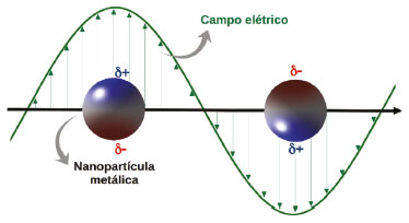 ![]() Figura 1. Perturbação da densidade eletrônica de uma nanoesfera provocada pela interação com o campo elétrico da radiação excitante. Adaptado com permissão da ref. 22. Copyright 2020 American Chemical Society