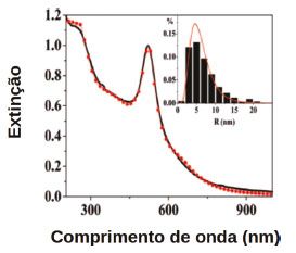 ![]() Figura 2. Comparação entre espectros de extinção de nanoesferas de Au experimental (linha preta) e obtido por simulações computacionais baseadas em eletrodinâmica clássica (vermelho). A correlação com o dado experimental é feita através da inclusão de dispersão de tamanhos (inserto, vermelho), que descreve muito bem as distribuições de tamanhos das nanopartículas (histograma preto) nos experimentos obtidas por análises de microscopia eletrônica. Reproduzido e adaptado com permissão da ref. 30. Copyright 2020 American Chemical Society