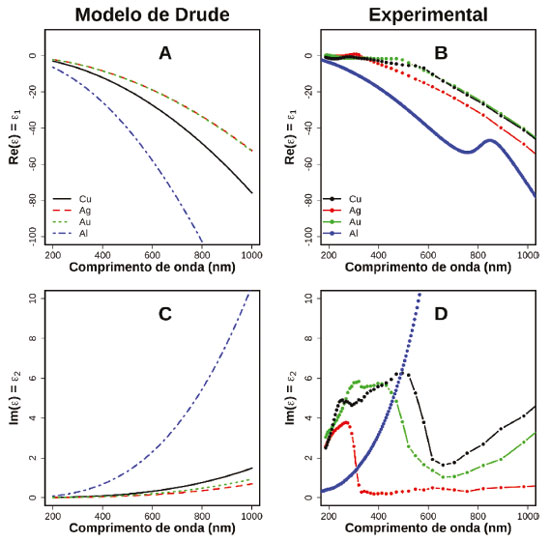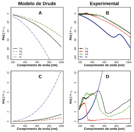 ![]() Figura 3. Comparação entre modelo de Drude e dados experimentais para as partes real (A e B) e imaginária (C e D) da função dielétrica de Cu (preto), Ag (vermelho), Au (verde) e Al (azul). O resultado do modelo de Drude considera parâmetros como densidade de elétrons e tempo médio de colisão, que são tabelados.38 Os dados experimentais para Au, Ag e Cu foram extraídas da compilação de Johnson e Christy, enquanto os dados de Al foram obtidos do trabalho de McPeak et al.39 Funções dielétricas de diferentes materiais podem ser consultados na referência 40