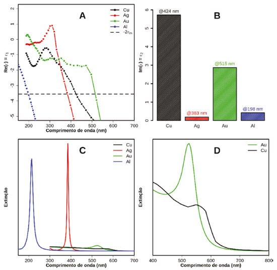 ![]() Figura 4. (A) Parte real da função dielétrica de alguns metais selecionados. A linha tracejada horizontal representa a condição imposta pela Eq. 5 considerando-se água como ambiente químico em torno da nanopartícula (constante dielétrica igual a 1,7744). (B) Valores da parte imaginária da constante dielétrica nos comprimentos de onda em que a Eq. 5 é respeitada. (C) Espectros de extinção simulados para nanoesferas de 10 nm de diâmetro para metais selecionados. (D) Ampliação dos espectros de extinção para as nanoesferas de Au e Cu