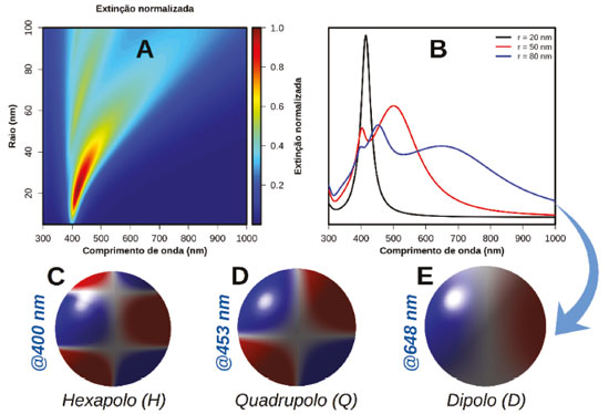 ![]() Figura 5. (A) Espectros de extinção simulados de nanoesferas de Ag de diferentes tamanhos. Os valores das seções de choque de extinção foram normalizados pelo valor de máximo na sequência de espectros. (B) Apresentação em detalhe dos espectros para nanoesferas de Ag de raio 20, 50 e 80 nm. A nanopartícula de raio 80 nm apresenta três bandas plasmônicas, para as quais as densidades de carga na ressonância estão apresentadas em (C), (D) e (E)