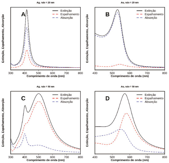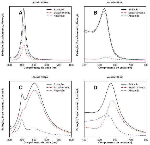 ![]() Figura 6. Espectros de extinção (preto, linha cheia), absorção (azul, tracejado) e espalhamento (vermelho, tracejado) para nanoesferas de Ag (A e C) e Au (B e D) de 20 nm e 50 nm de raio