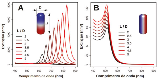 ![]() Figura 7. (A e B) Espectros de nanobastões de Au (AuNRs) de diferentes razões de aspecto (L/D) que variam de 2 a 5, conforme as cores nas figuras. Em todos os casos D =10 nm. Em (A) a polarização do campo elétrico da radiação incidente é paralela ao eixo principal (direção do comprimento L na figura) do nanobastão, enquanto em (B) é perpendicular. Nas figuras são apresentadas as distribuições de carga calculadas nos comprimentos de onda associados aos modos plasmônicos