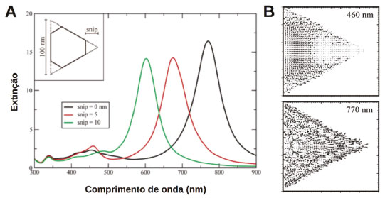 Os espectros apresentados nas Figuras 7A e 7B foram obtidos através de excitação com campo elétrico da radiação excitante paralelo e perpendicular ao eixo principal dos AuNRs, respectivamente. As diferentes cores nas figuras correspondem aos resultados para bastões de diferentes razões de aspecto (relação entre comprimento e largura). A ausência de modos quadrupolares nos espectros na Figura 7 está principalmente relacionada ao fato do metal considerado ser Au. Nota-se nas figuras que o modo transversal apresenta comprimentos de onda de ressonância menores do que aqueles associados ao modo longitudinal, o que está diretamente associado à menor dimensão da estrutura nesta direção. Além disso, observa-se dependência com a razão de aspecto (L/D) dos AuNRs, principalmente para o modo longitudinal, com elevado caráter modular da ressonância plasmônica para este tipo de estrutura. Nanoprismas Na Figura 8A são apresentados espectros de extinção simulados pelo método DDA para AgNTs com diferentes estruturas criadas pelo corte das pontas ("snip" como chamados pelos autores).22 Em sínteses desta morfologia, misturas destas estruturas podem ser obtidas e, portanto, é fundamental avaliar os efeitos deste tipo de alteração sobre os espectros de extinção.