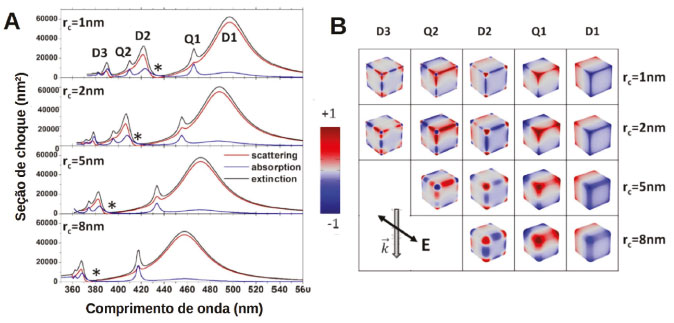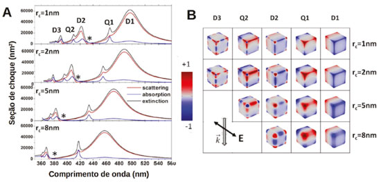 ![]() Figura 9. (A) Espectros de extinção (preto), absorção (azul) e espalhamento (vermelho) simulados pelo método FEM para AgNCs de 50 nm com diferentes graus de arredondamento introduzidos pela substituição das arestas e vértices por cilindros e esferas de raio rc. (B) Distribuições de carga para os modos observados para os AgNCs. Reproduzido e adaptado com permissão da ref. 115. Copyright 2020 American Chemical Society