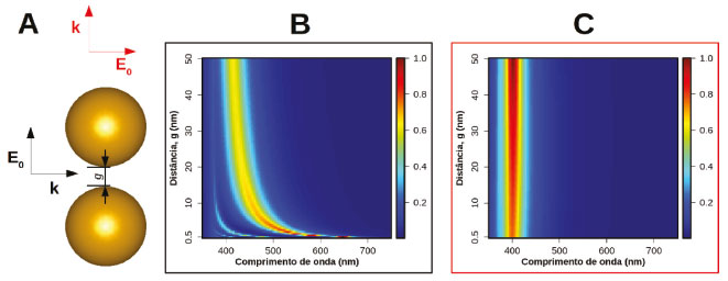 Os dados apresentados na Figura 9 são para AgNCs com diferentes estruturas relacionadas ao grau de arredondamento das arestas e vértices. Estas estruturas são geradas a partir do nanocubo perfeito através da substituição dos vértices e arestas por esferas e cilindros com raio rc. Para o AgNC com rc de 1 nm, são observados mais modos que no caso de esferas de mesmo tamanho. A Figura 9B apresenta as distribuições de carga para os modos observados nos espectros. Os modos descritos por D1, D2 e D3 são atribuídos a modos do tipo dipolar, enquanto os modos Q1 e Q2 apresentam distribuição antissimétrica de cargas associadas a distribuições do tipo quadrupolares. Estas características destacam os nanocubos das nanoesferas que apresentam apenas um modo dipolar e um quadrupolar. O grau de arredondamento dos AgNCs altera profundamente os comprimentos de onda de ressonância. Os espectros de AgNCs mais arredondados se aproximam mais daqueles observados para AgNSs. Os exemplos de efeito de forma sobre a resposta plasmônica de nanopartículas apresentados acima indicam a possibilidade de se efetuar um ajuste fino da ressonância plasmônica com a alteração de aspectos geométricos das nanopartículas, como, por exemplo, a razão de aspectos de nanobastões ou o controle sobre o grau de arredondamento de nanocubos. Este ajuste fino pressupõe um controle sobre a forma (e tamanho) de nanopartículas sintetizadas para uma determinada aplicação, o que é uma grande barreira experimental, já que diversos fatores podem levar a caminhos reacionais diferentes na síntese, tais como tipo de redutor e estabilizante utilizados, a velocidade de adição de reagentes e a temperatura reacional, para citar alguns. Recentemente, Xia et al.51 apresentaram uma perspectiva a respeito destes efeitos visando maior controle sobre forma e tamanho de nanopartículas. Acoplamento entre nanopartículas metálicas Além das características associadas as ressonâncias para nanopartículas individuais descritas acima, interações entre nanopartículas são fundamentais para aplicações envolvendo nanomateriais plasmônicos. Por simplicidade descreveremos tais interações para o caso de dímeros de nanoesferas de Ag. As ideias desenvolvidas podem ser transferidas para sistemas com maior número de partículas bem como contendo estruturas de formas diferentes da esférica. A Figura 10 apresenta os espectros de extinção em função da distância de separação (g) entre as superfícies de nanoesferas de Ag de 25 nm de raio para duas polarizações da radiação excitante: paralela (Figura 10B) e perpendicular (Figura 10C) ao eixo que conecta as partículas, conforme indica o esquema da Figura 10A. Os perfis espectrais observados para grandes valores de g (por exemplo, g = 50 nm) são muito próximos aos de nanopartículas individuais, independente da polarização da radiação incidente, indicando que a excitação plasmônica de uma partícula tem pouca influência de partículas vizinhas mais distantes. Para polarização paralela ao eixo de separação interpartículas, observa-se que a diminuição da distância de separação leva a um deslocamento da banda plasmônica para maiores comprimentos de onda. Além disso, em pequenas separações pode ser observado um conjunto maior de bandas no espectro. Contudo, para polarização perpendicular ao eixo interpartículas, não são observadas diferenças expressivas com relação ao espectro de extinção de nanoesferas individuais, mostrando que nesta configuração de iluminação a ressonância de uma nanopartícula não é afetada de forma significativa pela presença da nanopartícula vizinha.