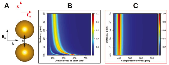 A Figura 12B apresenta os espectros de extinção para as duas polarizações da Figura 10A para o caso de g = 1 nm, em que se observa no espectro com polarização paralela ao eixo interpartículas duas bandas bem definidas que são deslocadas para maiores comprimentos de onda (menores energias) em relação a banda das nanoesferas individuais (próximo a 400 nm). As Figuras 12C e 12D apresentam as distribuições de carga para estas bandas, indicando que se tratam de interações em fase (estado ligante) entre modos plasmônicos de cada uma das nanoesferas. O modo de menor energia corresponde ao acoplamento entre modos dipolares, enquanto que o de maior energia tem contribuição de modos quadrupolares. Uma característica interessante sobre os dados apresentados na Figura 12B é que os modos antiligantes não são ativos para nenhuma das configurações de excitação analisadas. De fato, o modo antiligante apresentado no esquema da Figura 12A não é ativo para a excitação óptica, isto é, usando luz. Porém, é possível excitar tais modos com a utilização de feixe de elétrons como sonda. Tal técnica, conhecida como espectroscopia de perda de energia de elétrons ("electron energy loss spectroscopy", EELS), utiliza um microscópio eletrônico de altas resoluções espacial e energética para excitar transições entre níveis de energia no sistema estudado. Recentemente, a técnica EELS tem sido apresentada como uma ferramenta bastante poderosa para mapear os modos plasmônicos de nanoestruturas.37,128-131 Alguns princípios e ideias deste tipo de espectroscopia são apresentados neste trabalho. As Figuras 12E e 12F apresentam mapas bidimensionais de log10(|E|/|E0|) para os dois modos ligantes da Figura 12B, onde |E| e |E0| representam os módulos do campo elétrico local (em torno da nanoestrutura) e da radiação incidente, respectivamente. As figuras mostram que a excitação destes modos plasmônicos leva a um aumento bastante expressivo (em relação à radiação incidente) do campo elétrico em torno das nanopartículas, especialmente na região interpartículas, em que se nota amplificações de campo superiores a duas ordens de grandeza. Tais regiões de intensa localização de campo elétrico são comumente conhecidas pelo termo "hot spots" (HSs) e estão por trás de parte significativa das aplicações envolvendo nanopartículas plasmônicas em química, particularmente, as envolvendo dispositivos de sensoriamento e espectroscopias intensificadas, como o SERS. Deve-se destacar que o aumento local de campo elétrico é ainda mais importante em sistemas formados por nanopartículas com pontas, tais como nanobastões ou nanoprismas triangulares. Nestes casos, há uma considerável localização das intensificações nas pontas.22