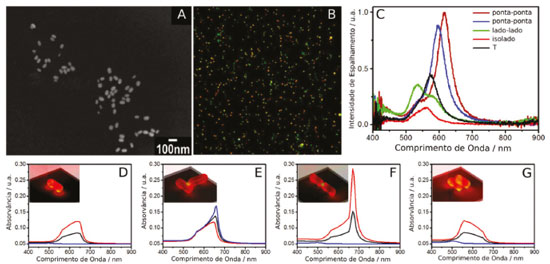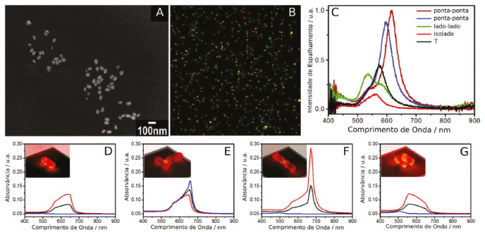 ![]() Figura 11. Caracterização morfológica e óptica de nanobastões de ouro. (A) Imagem de microscopia eletrônica de varredura. (B) Imagem de microscopia óptica de campo escuro. (C) Espectros de espalhamento Rayleigh de nanobastões de ouro em pontos contendo dímeros com diferentes orientações. (D-G) Espectros teóricos calculados para um único nanobastão e dímeros com diferentes orientações conforme mostrado nas figuras em destaque. A absorvância média (curva preta) e para um campo elétrico perpendicular (curva azul) e paralelo (curva vermelha) são mostradas. Reproduzida com permissão da ref. 126. Copyright 2020 American Chemical Society